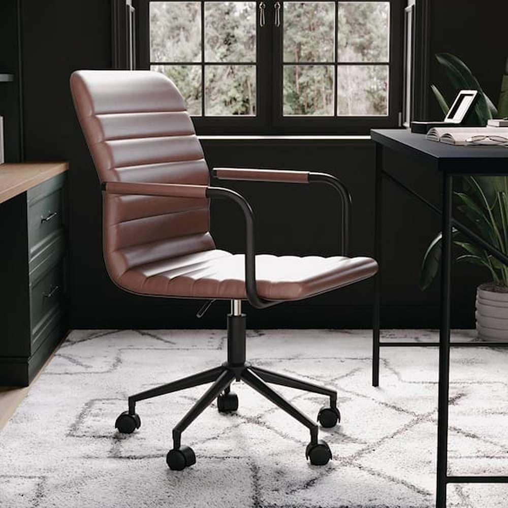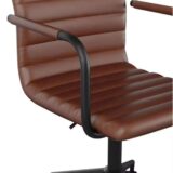 With its saddle brown LeatherSoft upholstery, this chair exudes sophistication while providing a smooth and supple surface that feels as luxurious as genuine leather but is easier to maintain. The oil-rubbed bronze metal frame adds a bold, contemporary touch that enhances its durability while complementing the warm tones of the upholstery. Together, these design elements make the Taytum chair a standout piece that enhances the look of any workspace.